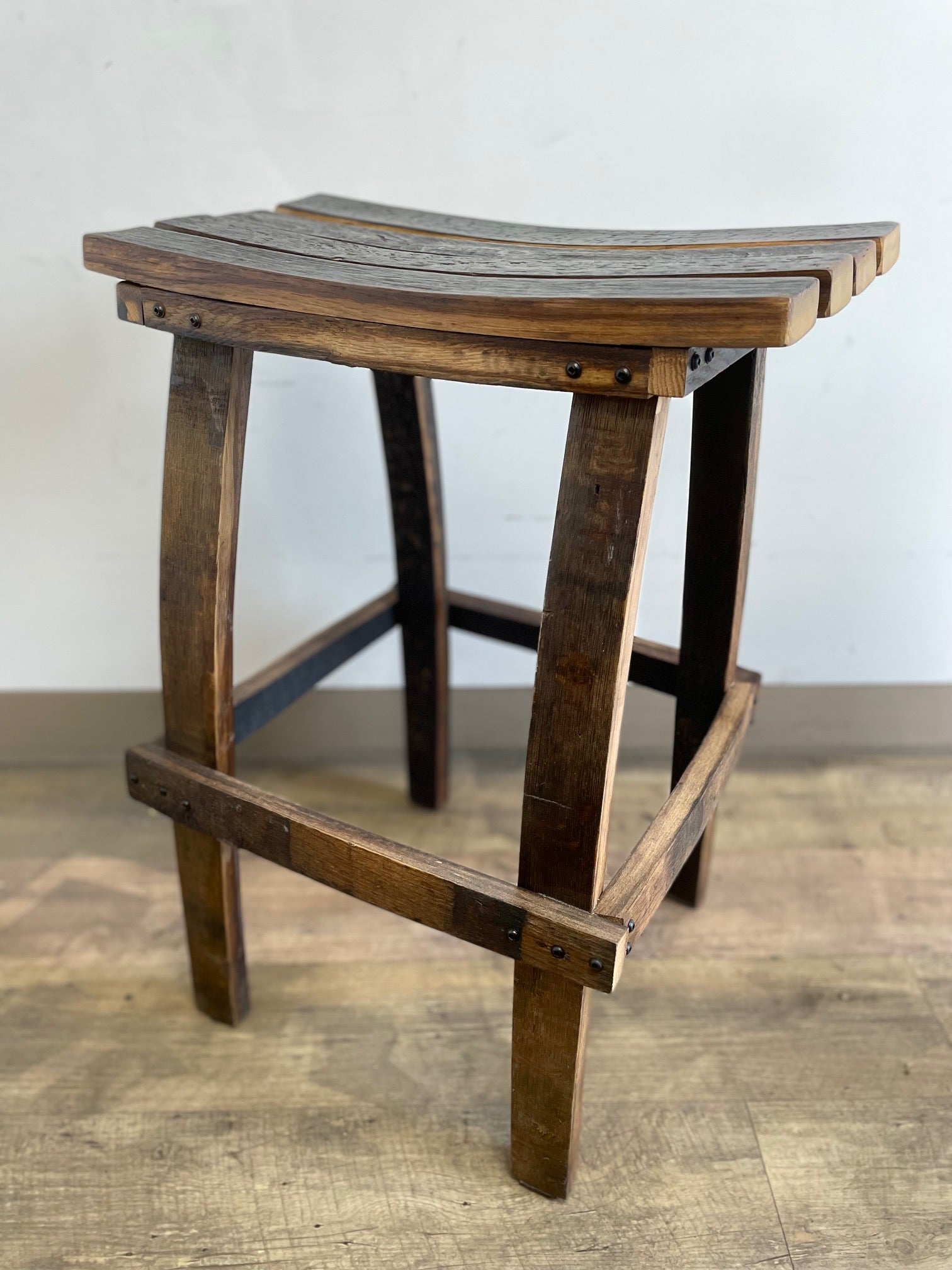Each stool features unique grain patterns, tone variations, and authentic barrel character.